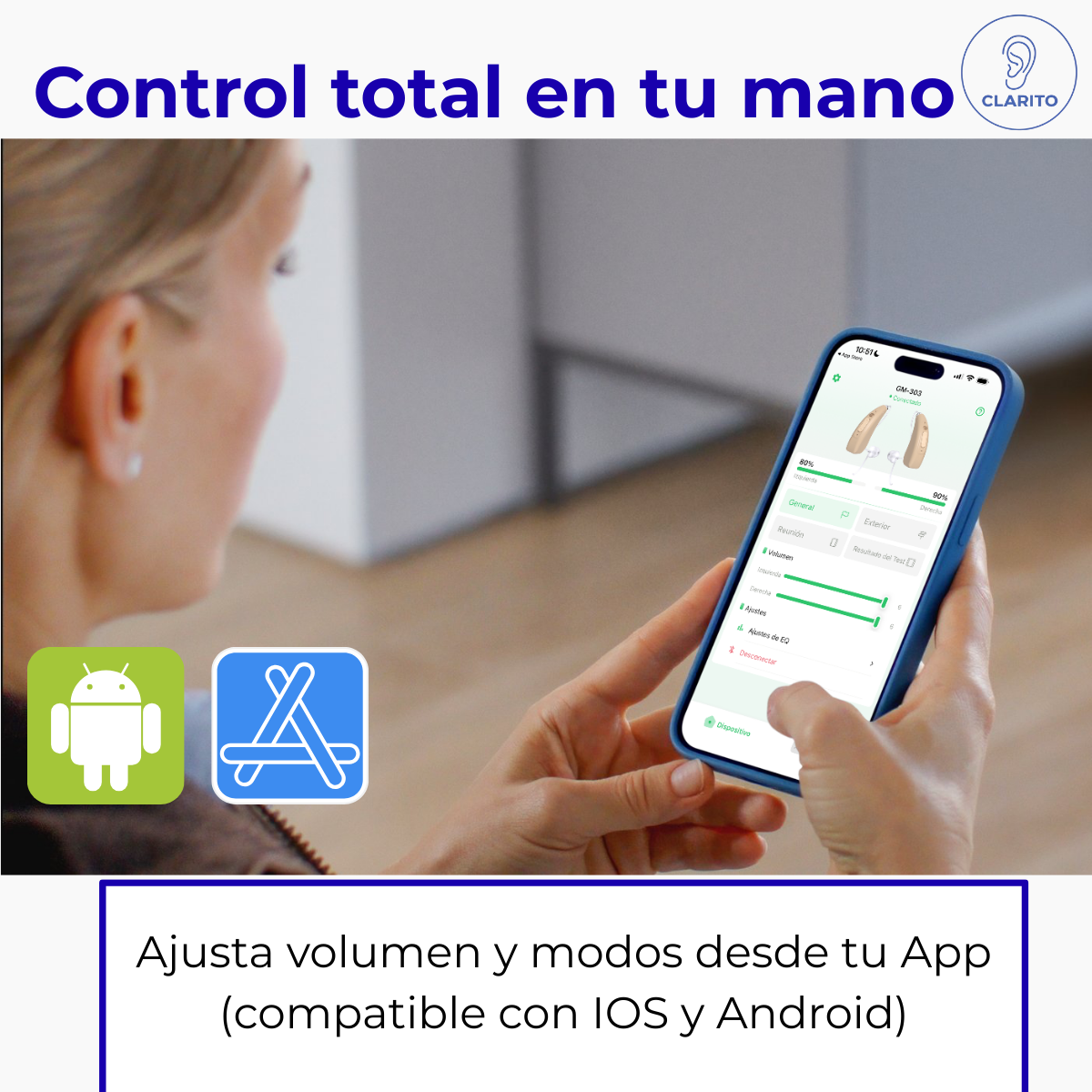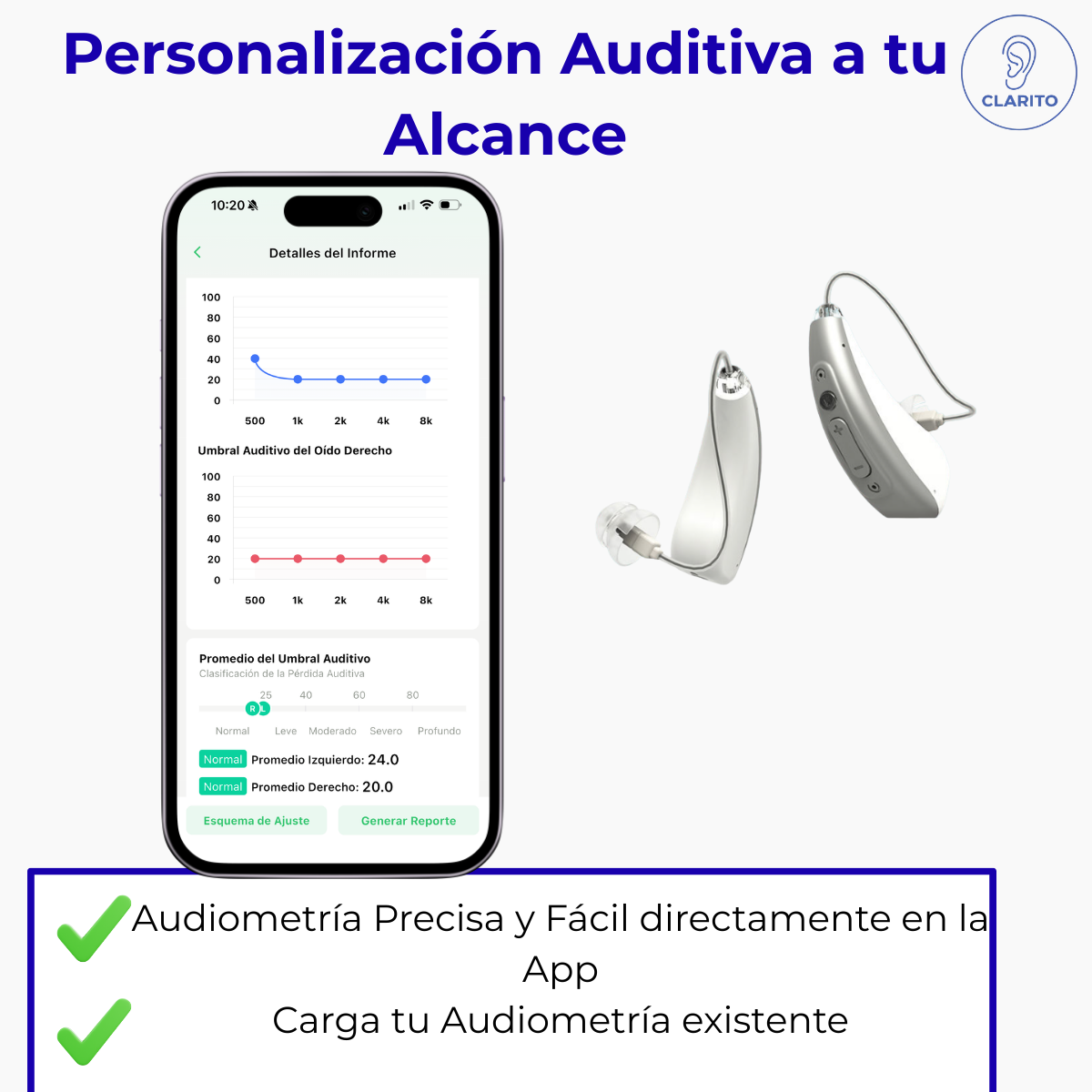 - Audiometría Personalizada: La App te permite realizar una prueba de audición real para crear un "mapa auditivo" único para tus oídos. El Clarito Pro se calibra automáticamente según tus necesidades específicas.
